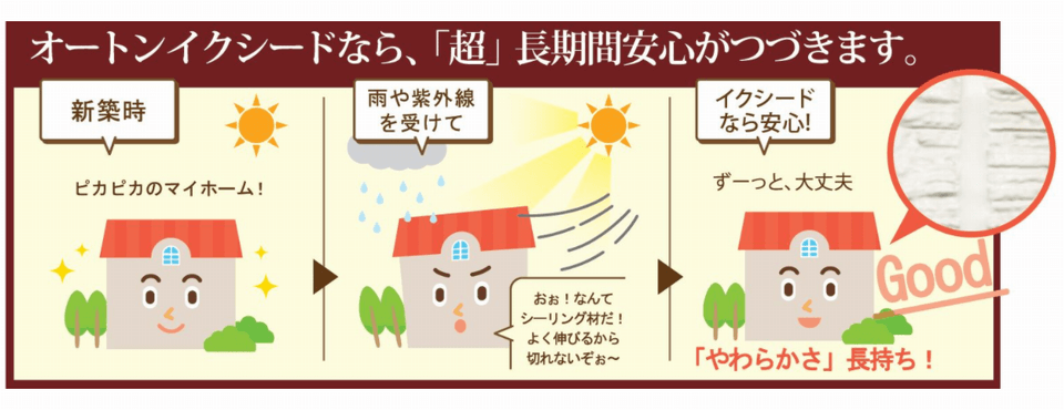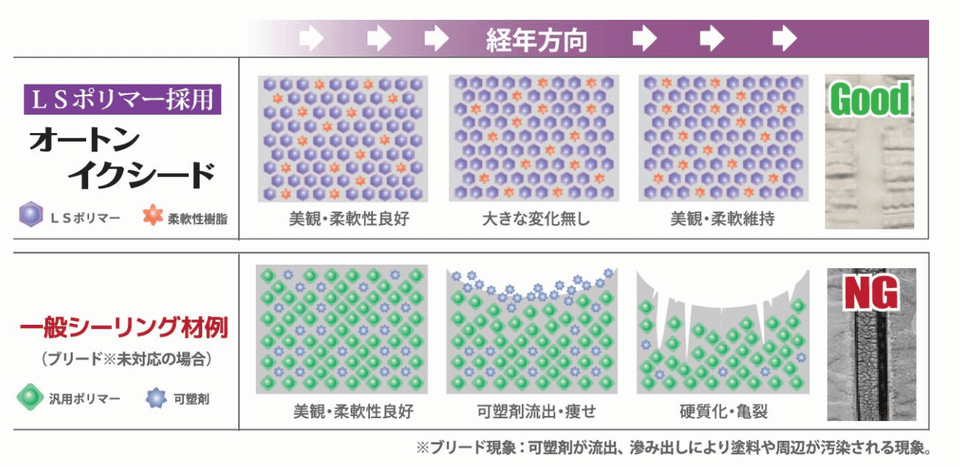 一番の他のコーキングとの違いと言えば、「ブリードするか、しないか」ここが一番大きいと思います。他のコーキングは可塑剤によりコーキングの柔らかさを保っているのに対して、オートンは「LSプリマ―」という新開発されたものでコーキングの柔らかさを保ち続けます。